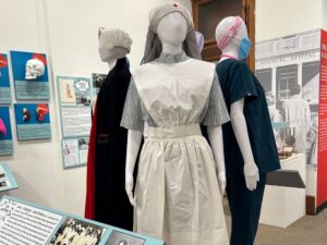 Dr. Marquardt was also an advocate for continuing education. He opened a nursing school in the hospital 1930. The exhibit featured an example textbook and an original nursing school uniform.