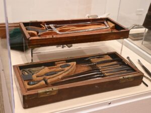 Among the artifacts displayed was a Civil War medical kit, the type that Dr. Heidmann carried as he moved through encampments and field hospitals with the Illinois 58th Infantry Regiment. This was an essential tool for a Civil War surgeon, designed to address the brutal injuries sustained on the battlefield. Dr. Heidmann also devoted time to combating infection and disease, which spread due to unsanitary conditions, inadequate nutrition, and overcrowded quarters.
